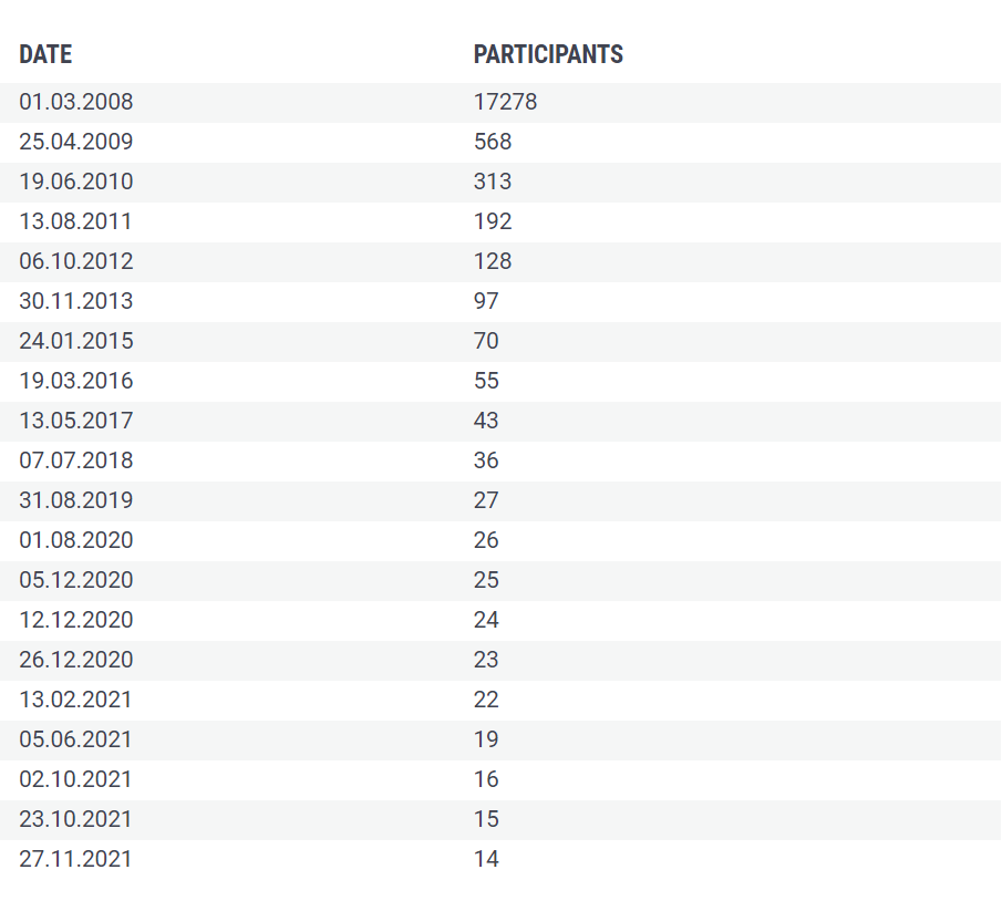 Vuonna 2008 kilpailun alkaessa siinä oli mukana yli 20 000 vedonlyöjää. Porsche 911:n arvo on noin 100 000 euroa. Alla on selvitys, millä tapaa pelaajia on tippunut pois. Tällä hetkellä mukana on 14 pelaajaa.