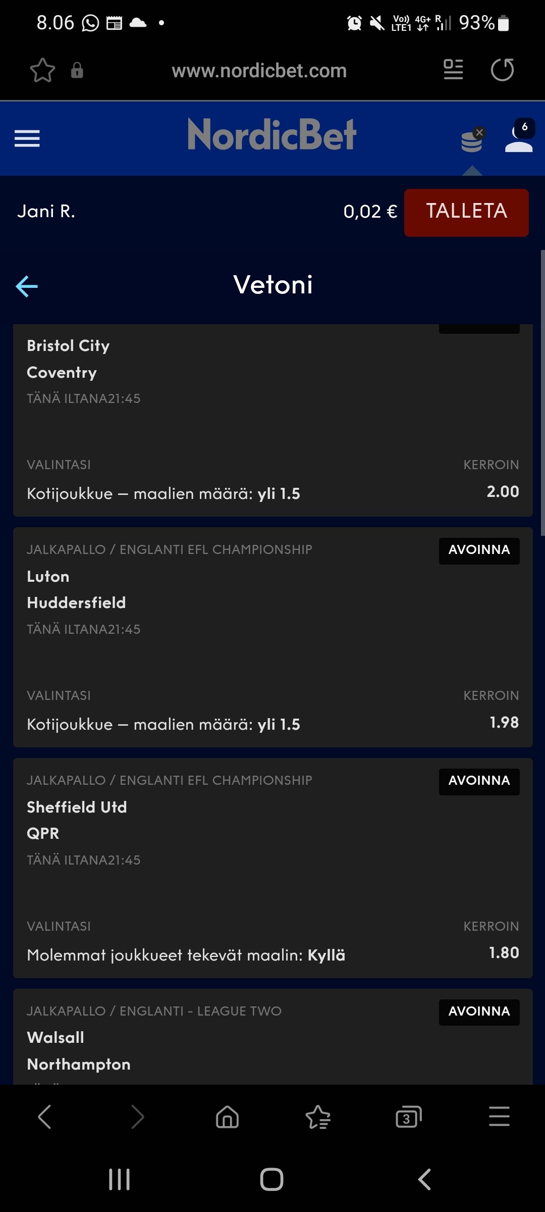 Huom! Viimeinen kohde on Northampton yli 1.5 maalia. Ei mahtunut kuvaan.