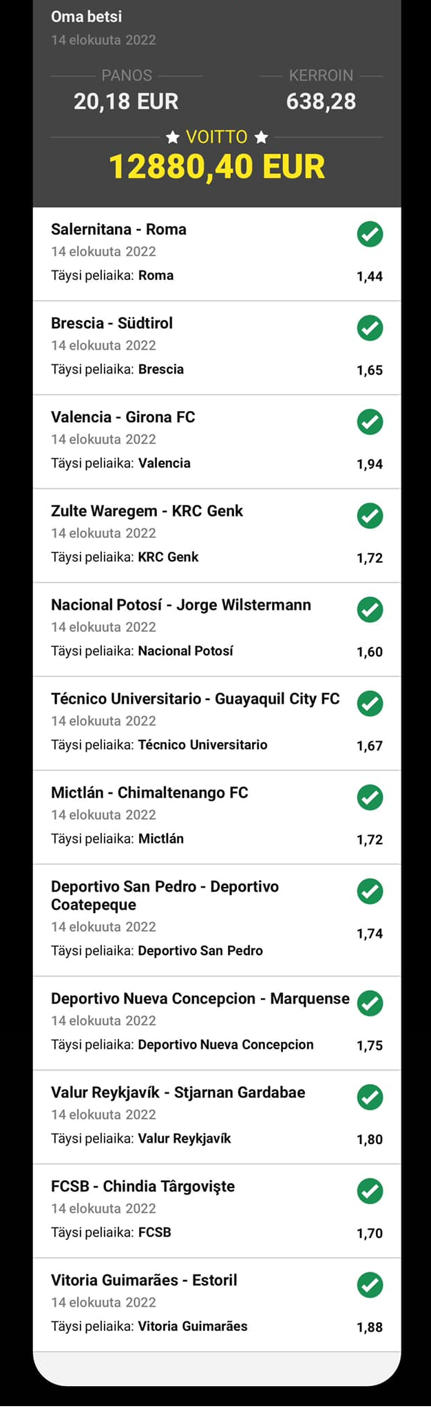 Pitkävetokuningas-ryhmässä saatiin pitkästä aikaa uusi kymppikerholainen (Lappu jossa voitto yli 10 000€). Lapun teki ryhmämme jäsen Ville, joka voitti 20€ panoksella yli 12 000€. Lapussa oli 12 eri kohdetta ja kerroin hulppea 638. Lappu kokonaisuudessaan alla, jonka jälkeen pieni Villen haastattelu.